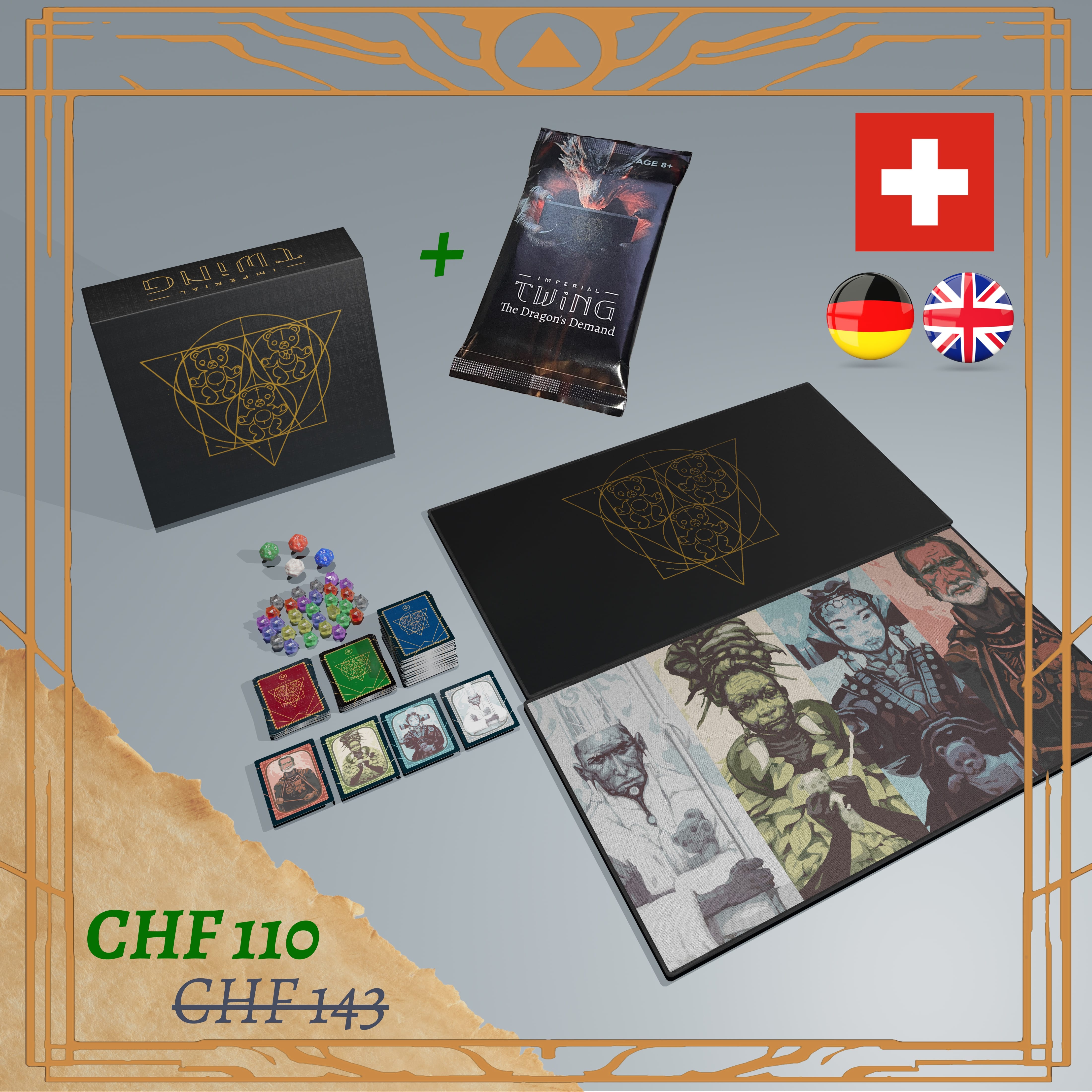 Le jeu de base Imperial Twing, l'extension The Dragon's Demand et deux tapis de jeu de ton choix, pour une expérience de duel parfaite à deux joueurs. Approuvé par l'archimage !